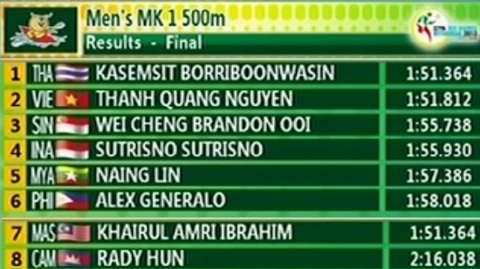 VĐV đứng thứ hai là người Singapore với thành tích 2'22"31. Nguyễn Thị Kim Tuyến đứng thứ 5 với thành tích 2'25"36. Đây là nội dung mà VĐV Thạch Kim Tuấn được xem là ứng cử viên sáng giá cho chiếc HCV - Phan Hồng từ Yangon (Myanmar). VĐV của Đoàn Việt Nam đang thi đấu với Lào. Ở nội dung 400 mét hỗn tạp cá nhân nam. Canoeing đã giành 1 HCB và 1HCĐ. Vật - 13h30: Vật tự do: Nguyễn Thị Lụa (51kg nữ).